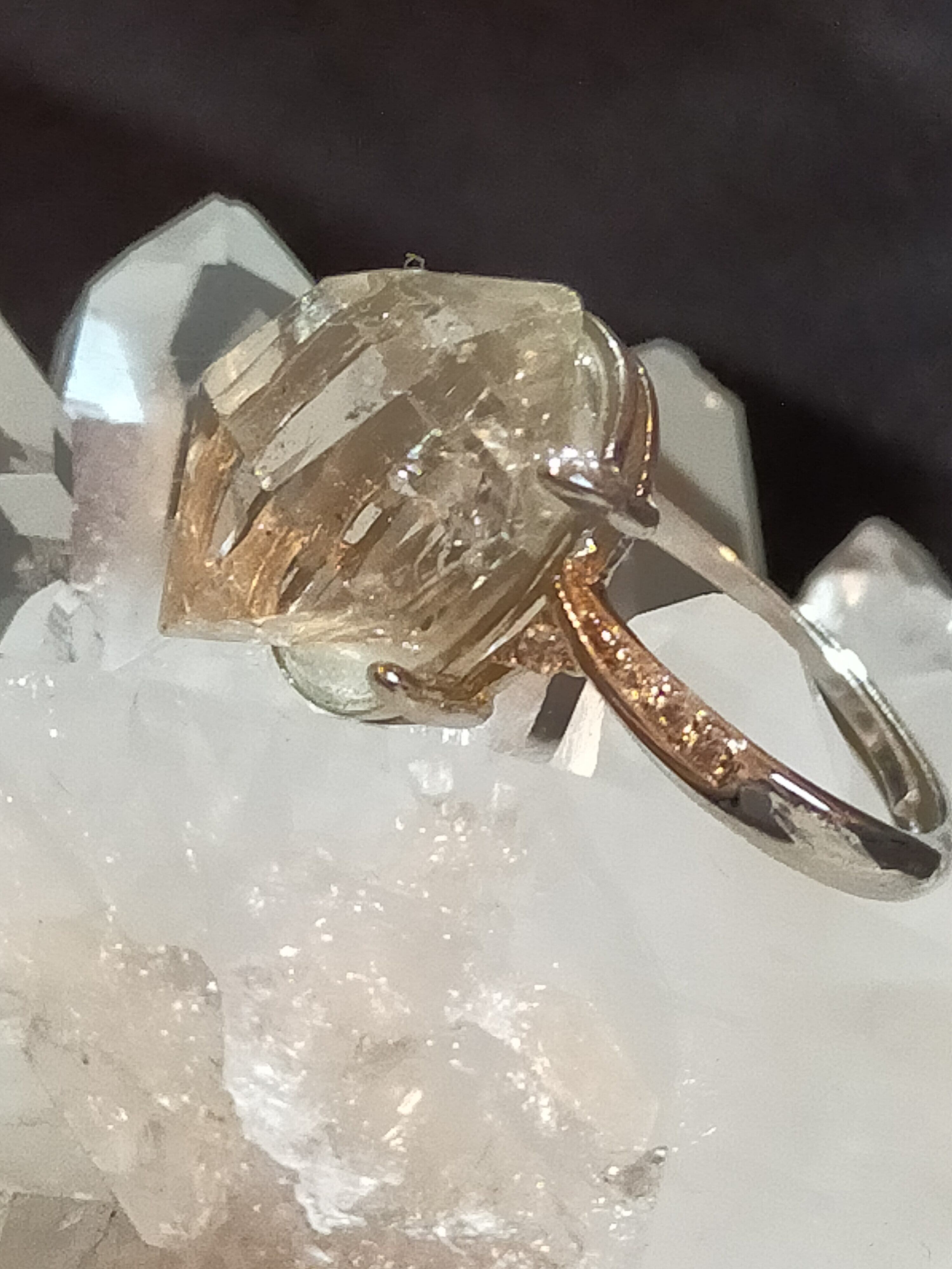 写真では照明の具合で少し黄色く見えますが、実際はとてもクリアなハーキマーダイヤモンドです。